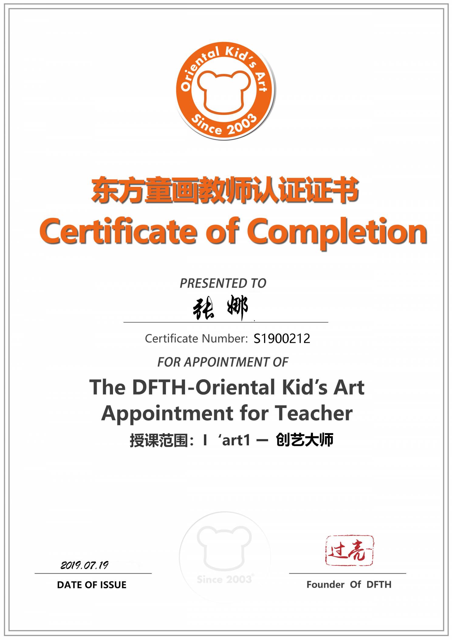 认证编号:S190212●张娜