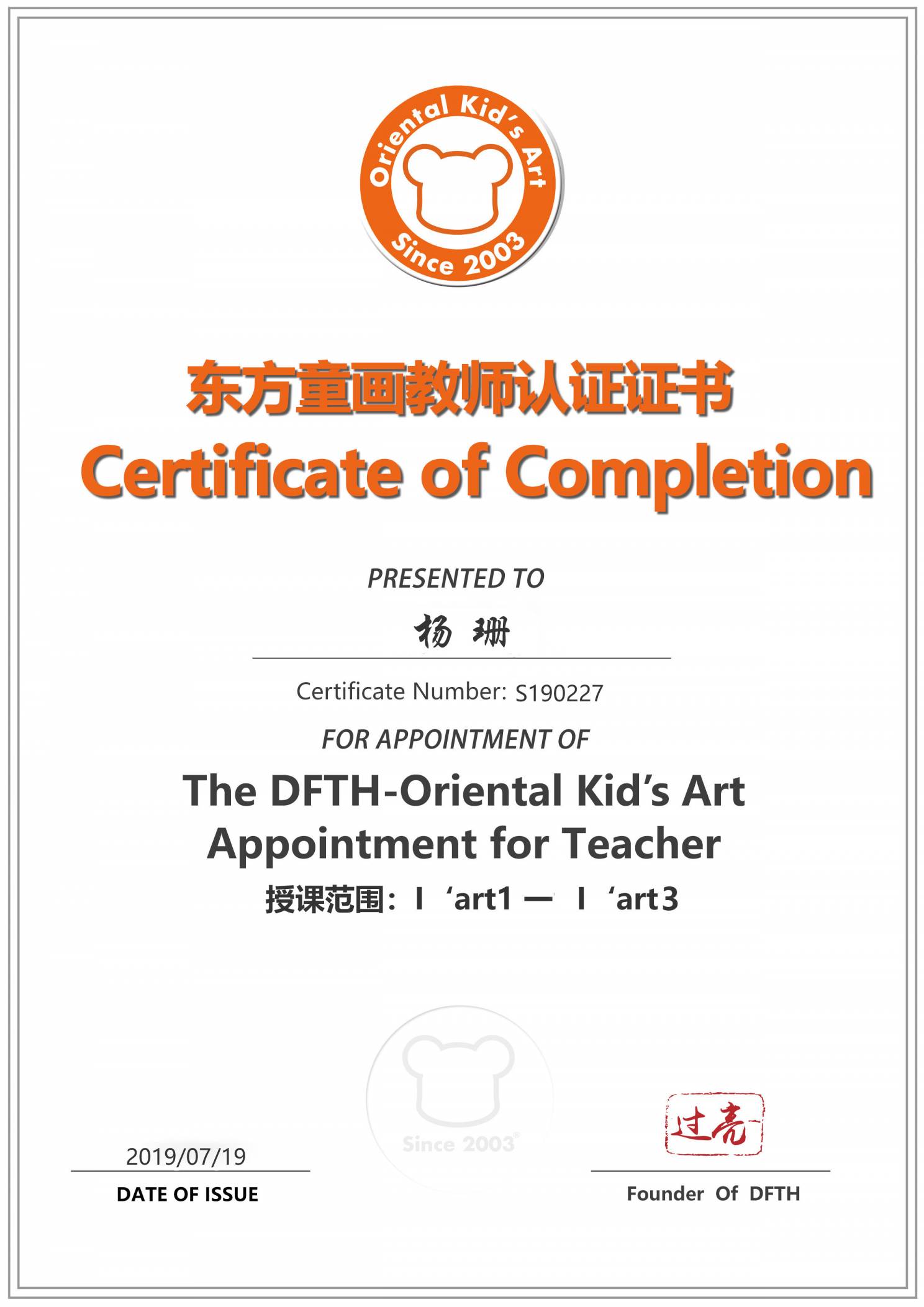 认证编号:S190227●杨珊