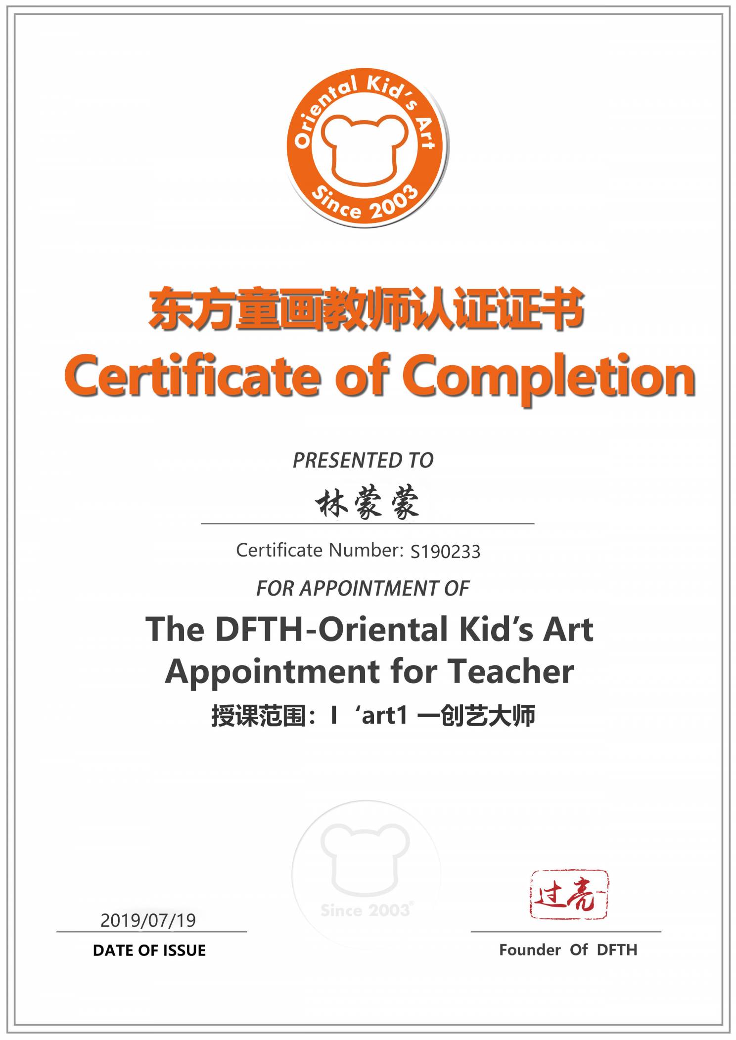 认证编号:S190233●林蒙蒙