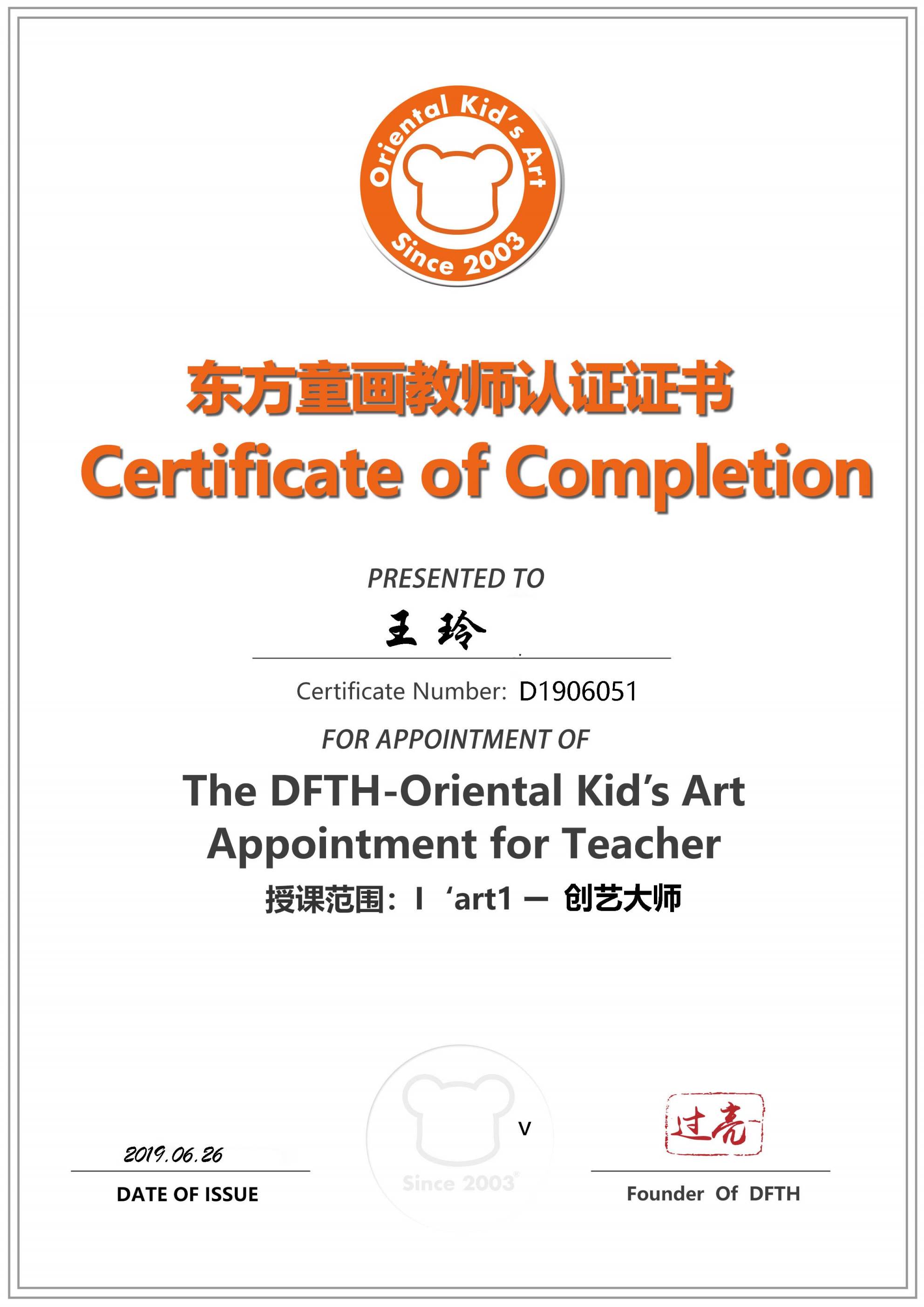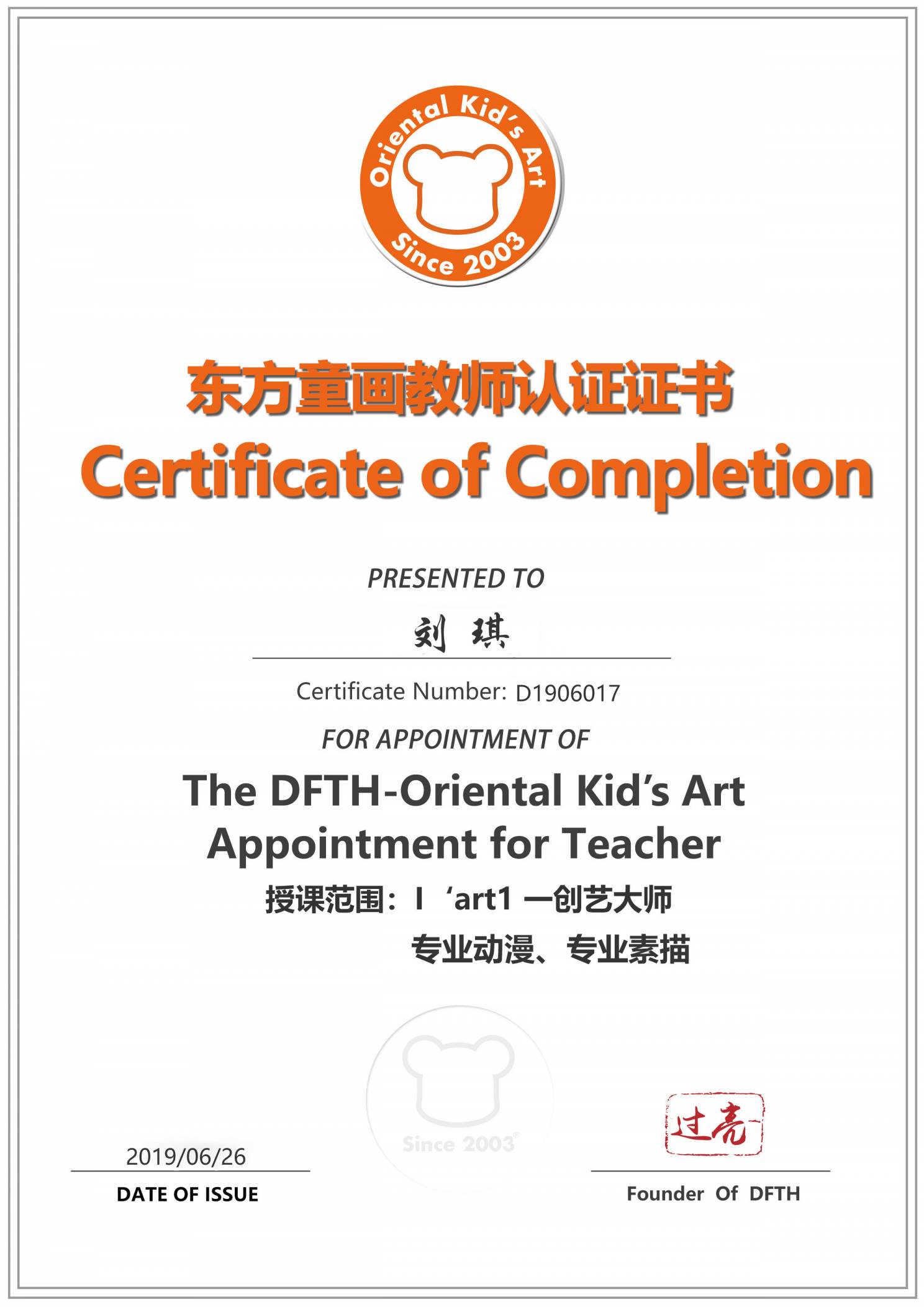 认证编号:D1906017●刘琪