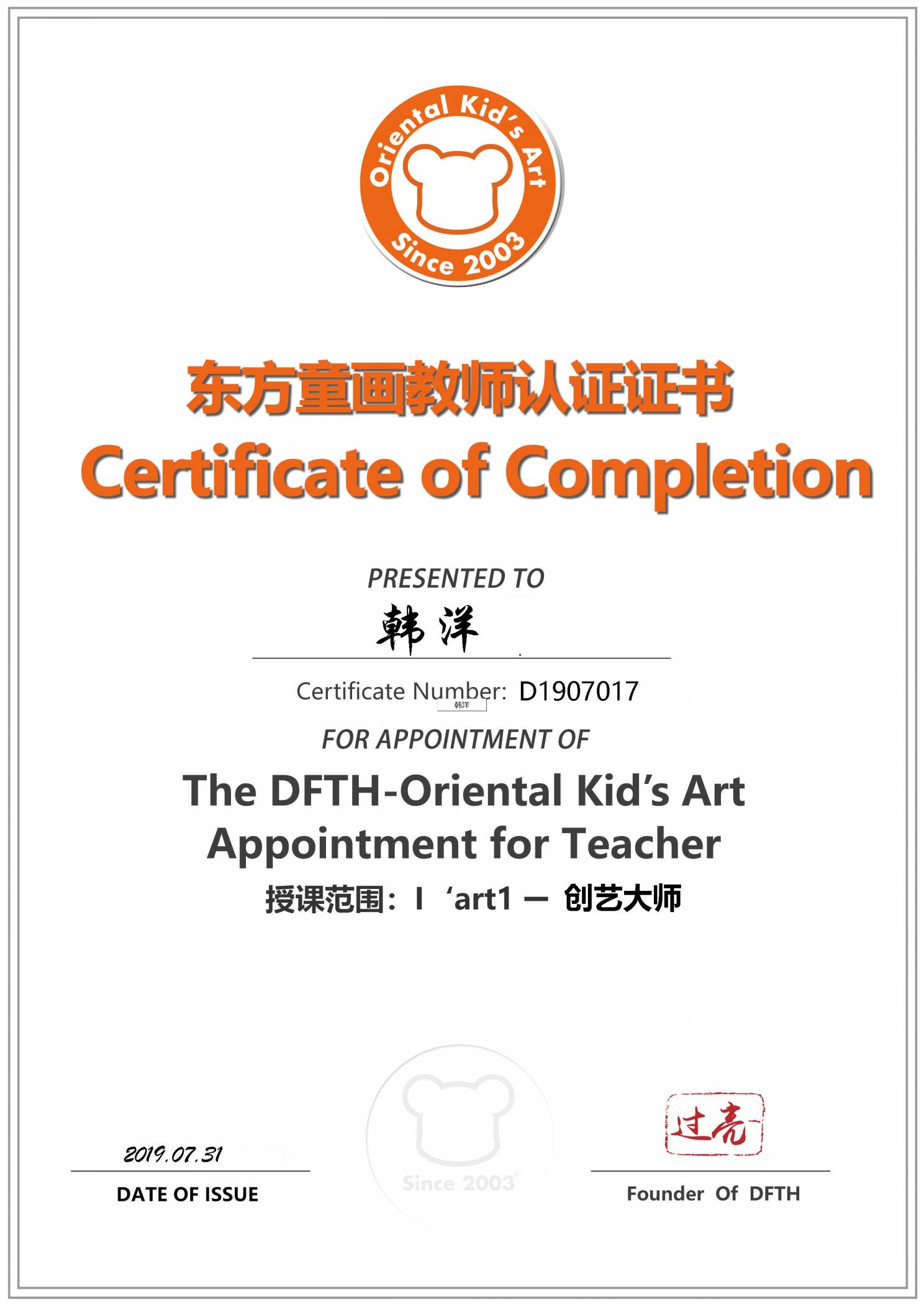 认证编号:D1905217●韩洋