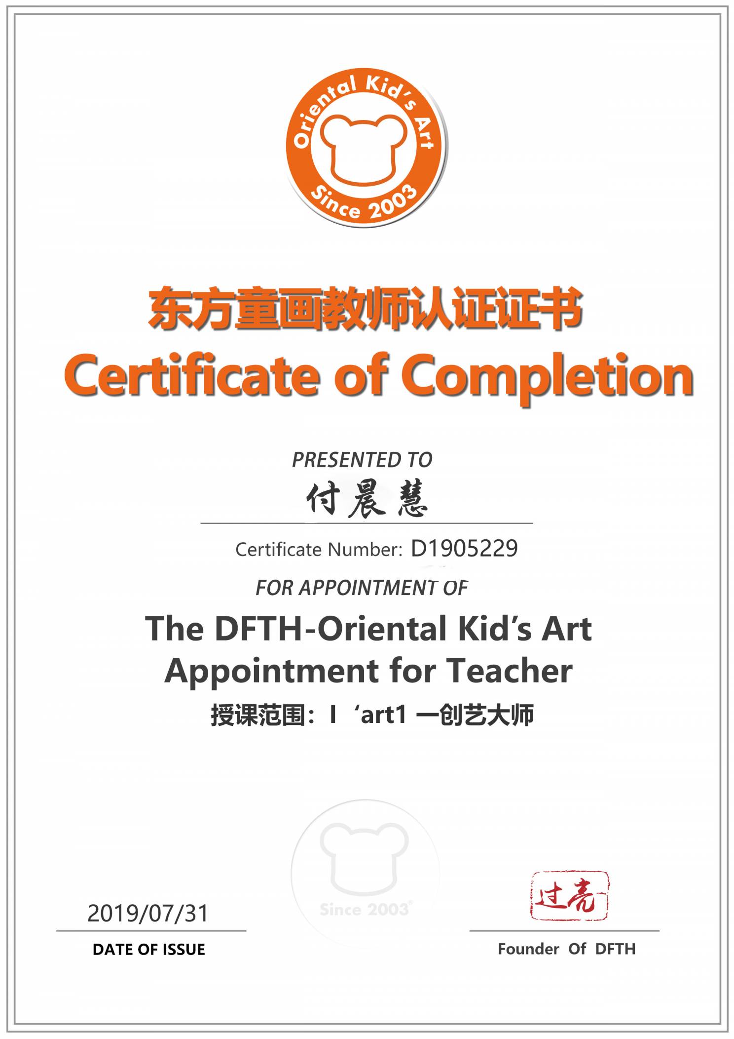 认证编号:D1905229●付晨慧