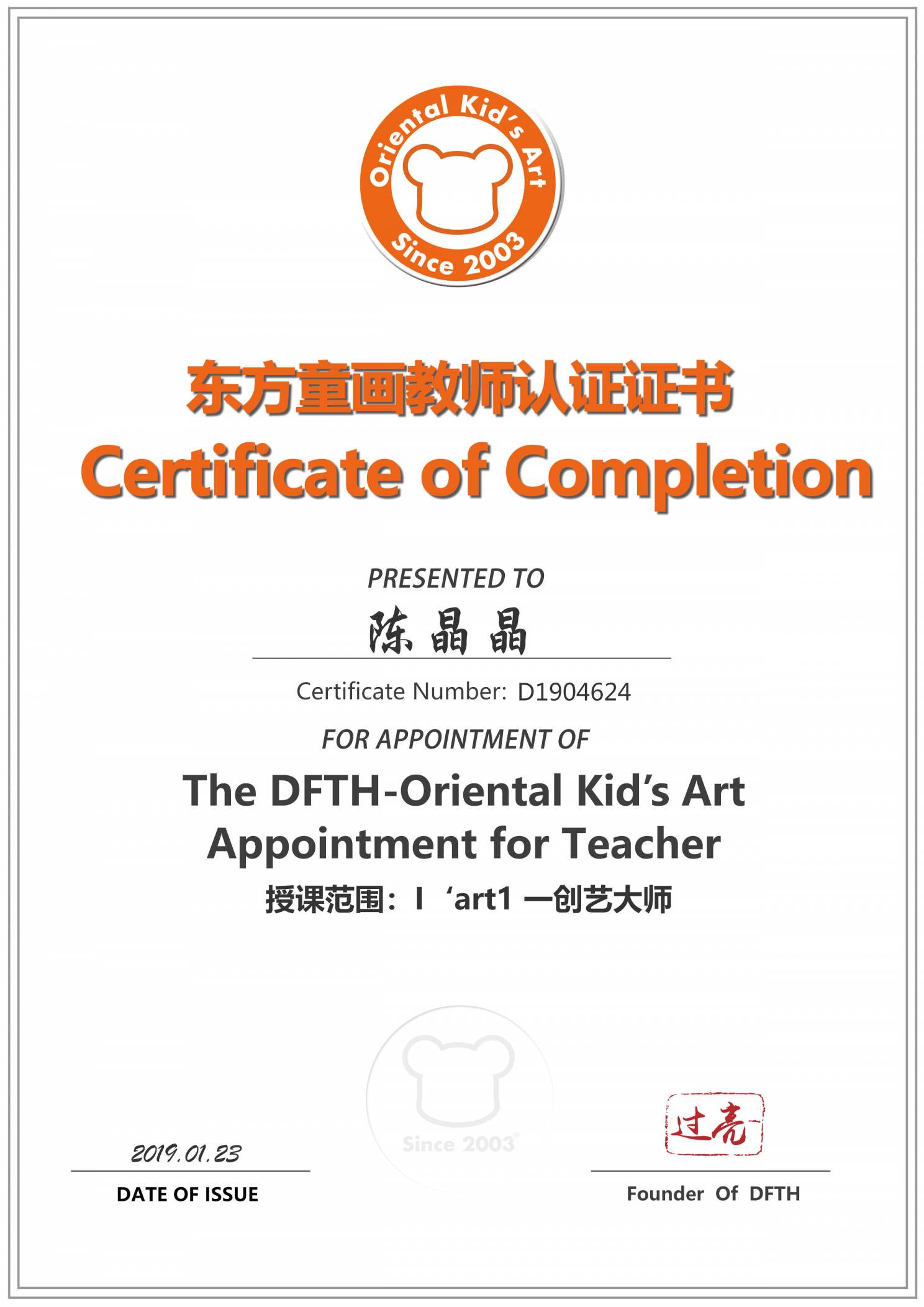 认证编号:D1904624●陈晶晶