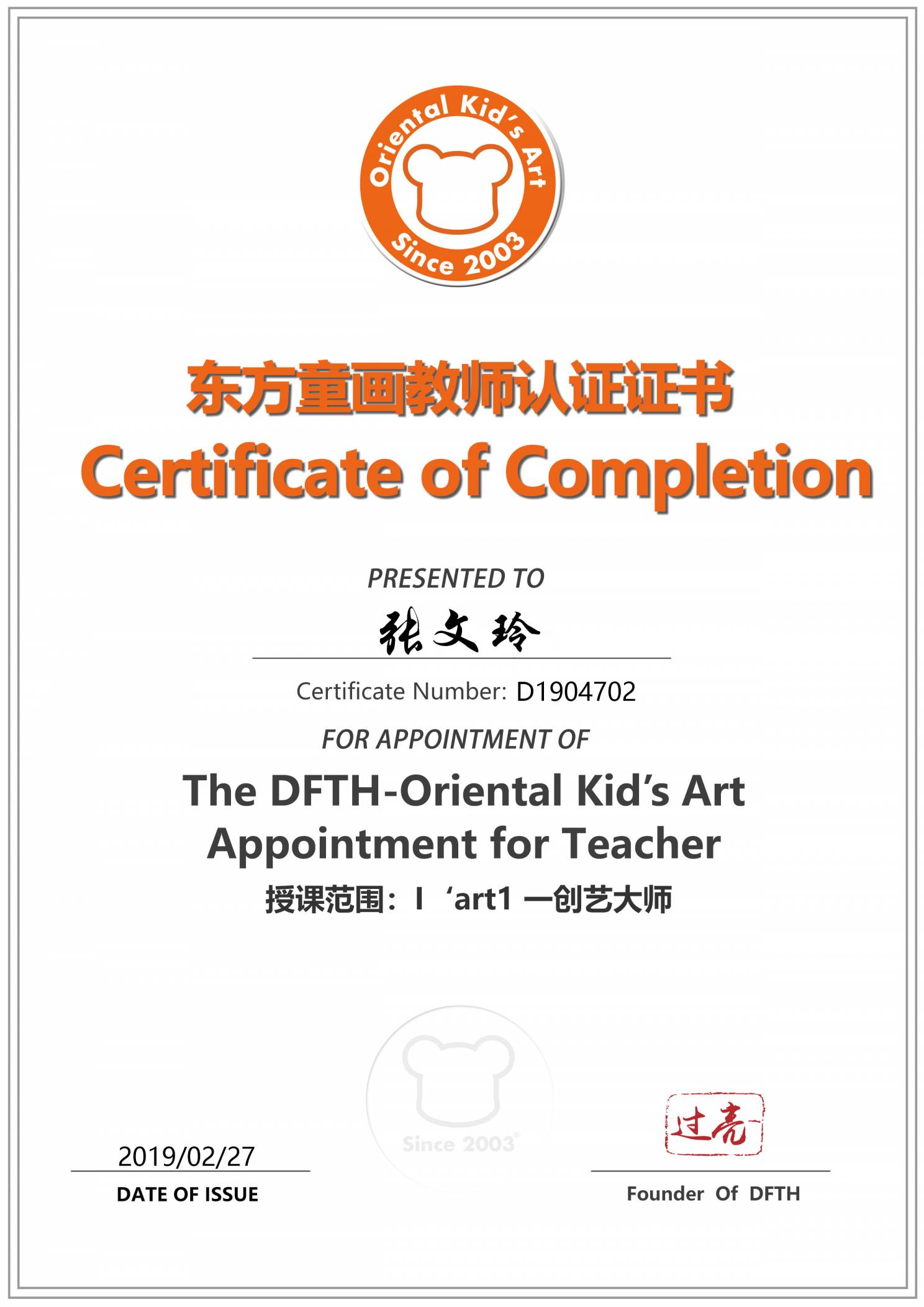 认证编号:D1904702●张文玲