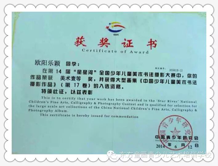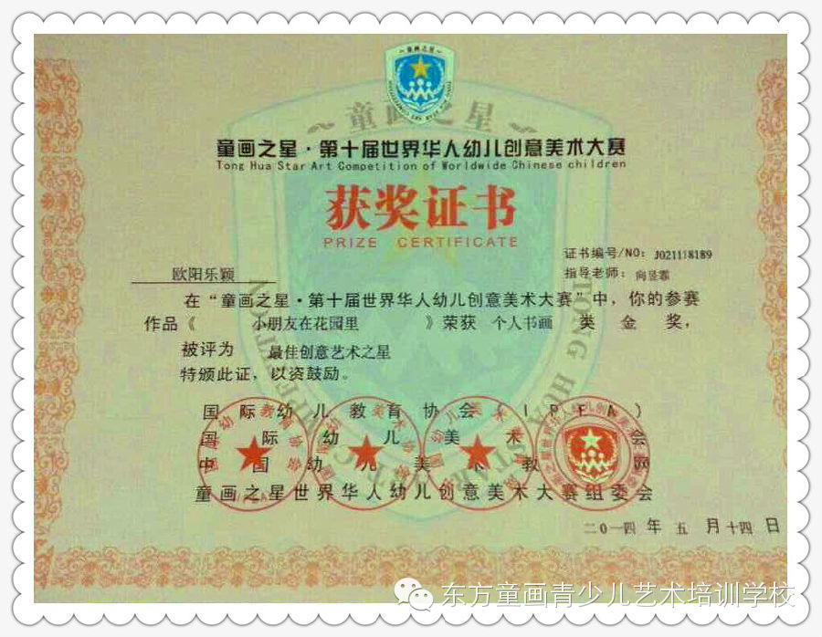 欧阳乐颖是徐老师儿童班中年纪最小也是最忠实的小学员。从幼启班开始画画天分逐渐展露,并且获得许多大大小小的奖项,第十四届全国青少年书画篆刻大赛金奖、华人幼儿创意美术大赛金奖、第14届“星星河”全国少年儿童美术书法摄影大赛美术一等奖。至此,希望在之后的时间里有更大进步~