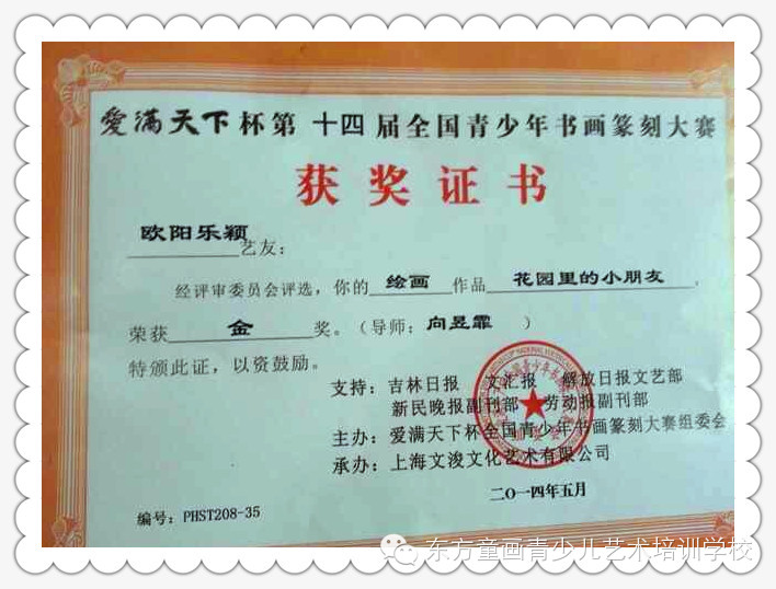 小乐颖五岁,上儿童班年纪算是小的了,但孩子并没有表现出小小年纪的怯弱,融入集体也比较快,省去了我多余的担心。自幼就表现出自己的喜好,牙牙学语的时候就开始涂涂画画,乐此不疲,进入幼启班的时候画画这件事让孩子每天的生活都充满了乐趣,当然还要感谢徐老师对我们家孩子的细心的照顾和手把手的教导。看到孩子陆陆续续的拿了些奖项还是很欣慰的。希望乐颖以后继续努力吧,快乐学习,快乐成长,在美好的年级里无忧无虑,青春作伴好读书。