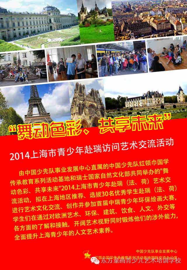 由红领巾国学传承教育系列活动基地和瑞士国家自然文化部共同举办的"舞动色彩、共享未来"2014上海市青少年赴瑞(法、荷)艺术交流活动,拟在上海地区推荐、选拔优秀学生赴瑞(法、荷)进行艺术文化交流、创作并参加首届届中瑞青少年环保绘画大赛,学生们在通过对欧洲艺术、环保、建筑、饮食、人文、外交等各方面的了解和接触,开阔艺术视野同时锻炼他们的涉外能力,全面提升上海青少年的人文艺术素养。