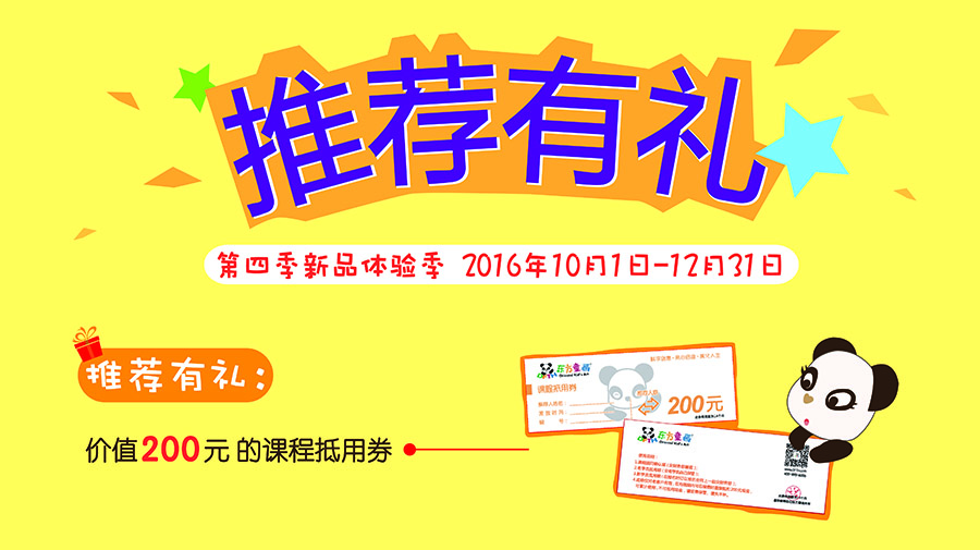 推荐有好礼东方童画学员成功推荐一名朋友报名,被推荐学员可享全年课程费用立减200元,推荐会员则获得价值200元的课程现金抵用券一张或者美术盒子一个(数量有限,送完为止),推荐学员越多,获得的课程现金抵用券越多,可累计或叠加使用!