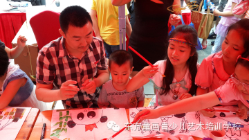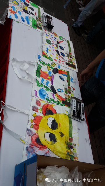 东方童画的老师们现场教孩子们绘画,在帆布上面绘画我们的吉祥物,小熊猫很讨孩子们喜欢~