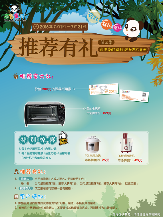 2016年7月1日至2016年9月30日,凡成功推荐一名新学员报名,推荐人和被推荐人都可在东方童画的就读门店领取价值299元的美的电烤炉一台及价值200元的东方童画课程抵用券一张。