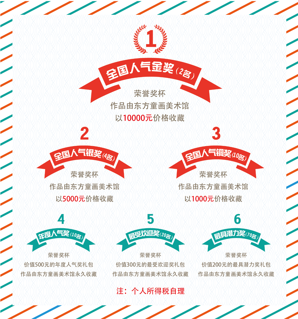 集体奖项:集体组织参赛当届累计50幅以上:授予“优秀少儿教育组织”,颁发牌匾。