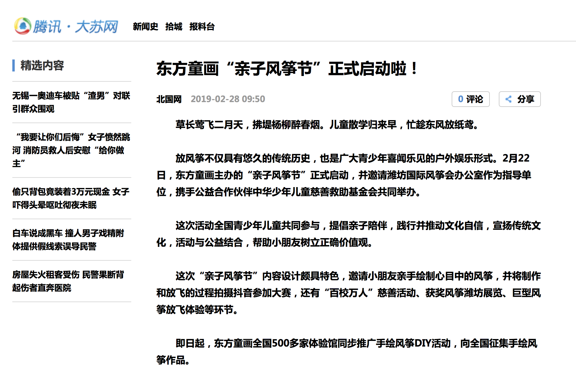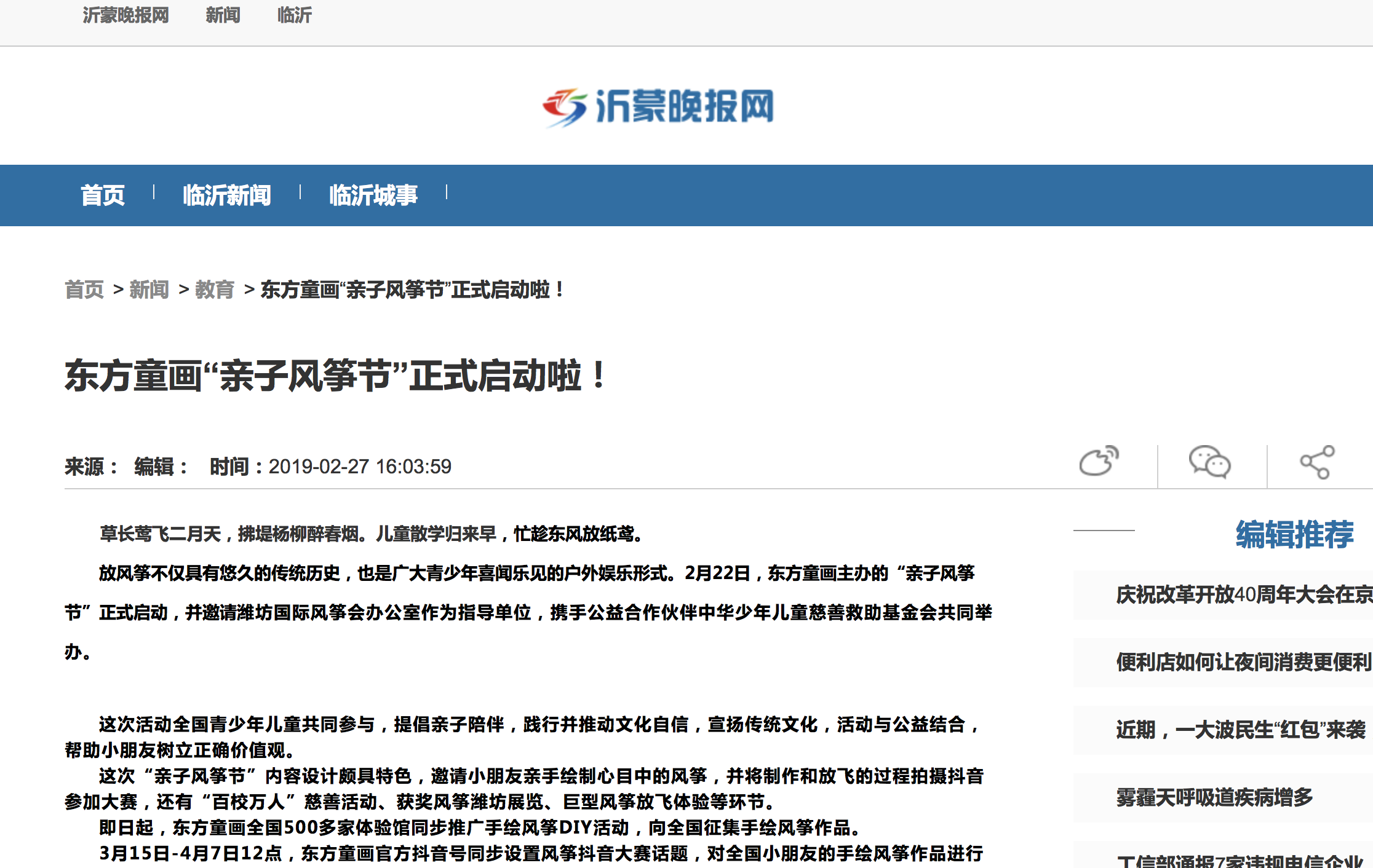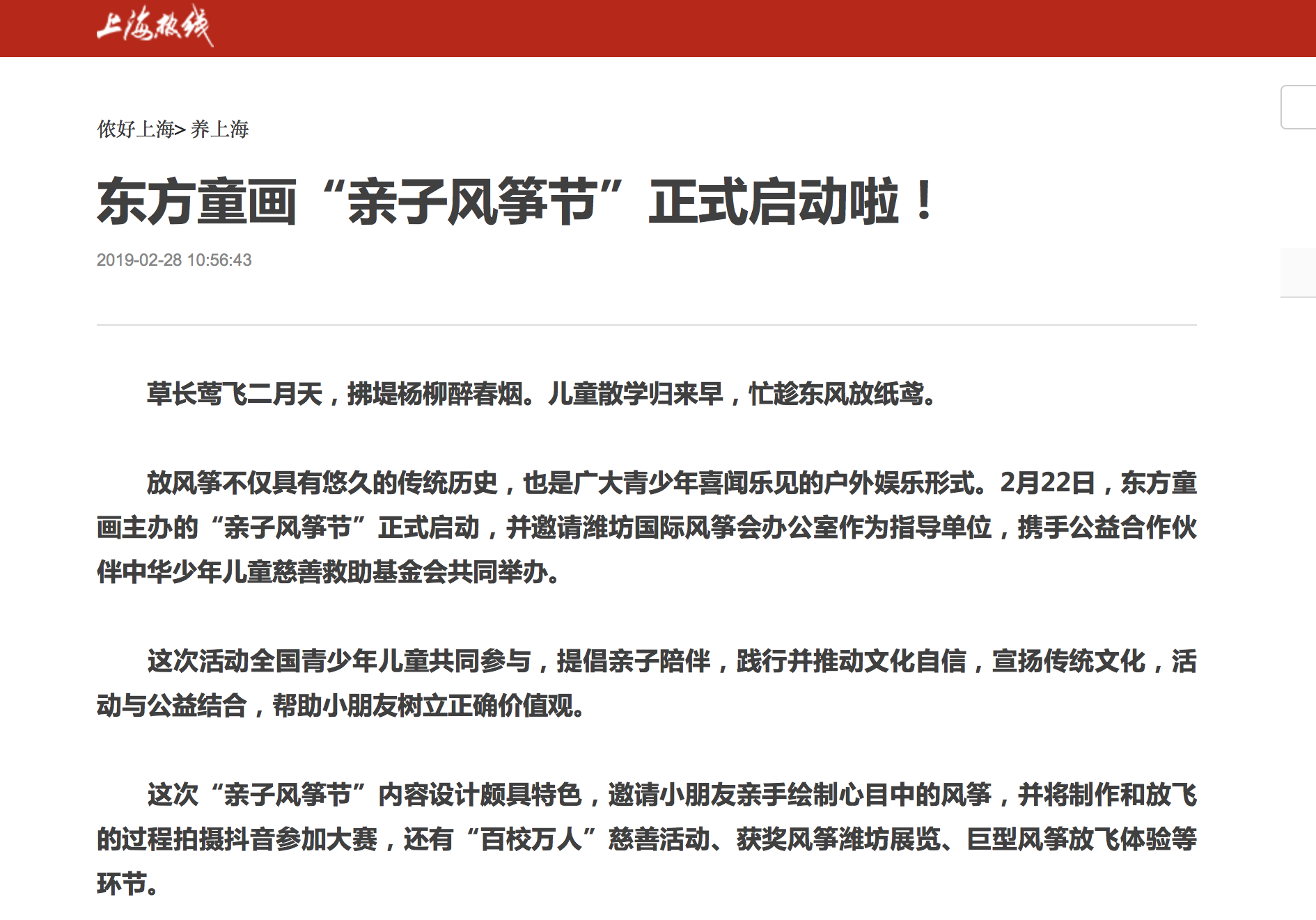 2019年2月22日,由东方童画主办,潍坊国际风筝会办公室作为指导单位,携手公益合作伙伴中华少年儿童慈善救助基金会的“东方童画亲子风筝节”正式启动。